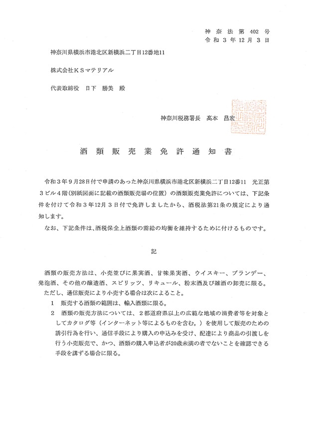 | 酒類販売業免許 | 神奈法第402号 |